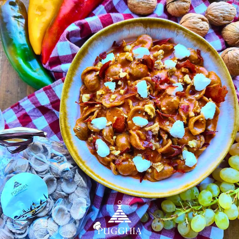 4. Manteca e servi: scola le orecchiette, uniscile al pesto di peperoni e amalgama con cura. Aggiungi lo speck croccante, le noci e completa con piccoli fiocchi di ricotta fresca. Un filo d’olio Pugghia a crudo renderà il tutto armonioso e profumato.